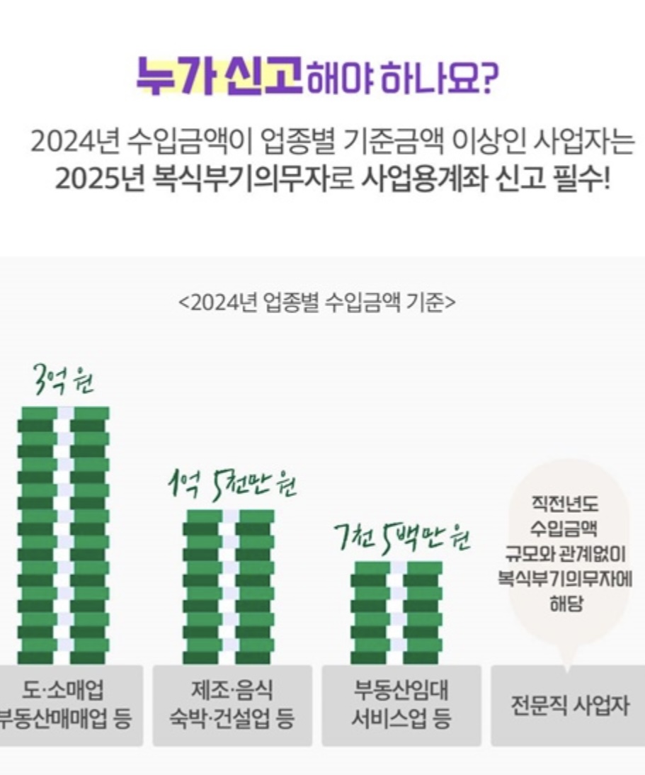- 음식업, 숙박업, 서비스업 등: 연 수입금액 1.5억 원 이상