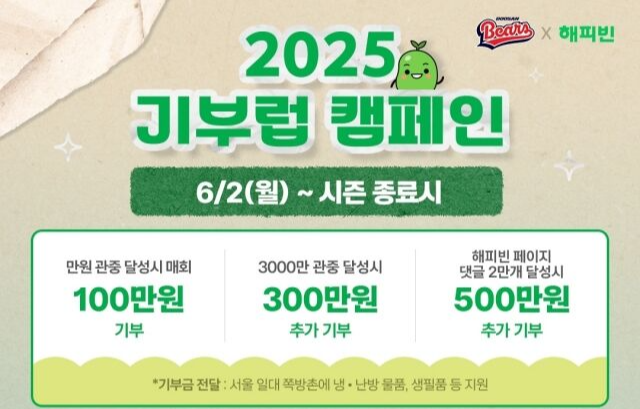 올해 캠페인은 서울 쪽방촌 주민들을 위한 모금 활동으로, 홈경기 매진, 팬 댓글, 해피빈 기부 참여를 통해 기부금이 적립됩니다.